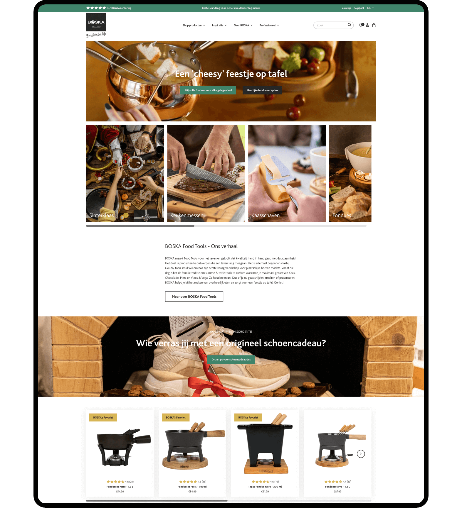 BOSKA is een Nederlands familiebedrijf dat al sinds 1896 food tools maakt die een leven lang meegaan - kwaliteit voorop. Bij Code zijn we trots dat we onszelf al vijf jaar BOSKA’s e-commerce partner mogen noemen. In 2017 verzorgden we BOSKA’s migratie van Magento naar Shopify Plus, inclusief een custom B2B omgeving en vandaag de dag staat er een toekomstbestendige Shopify B2C en B2B online store voor de Europese en Amerikaanse markt.