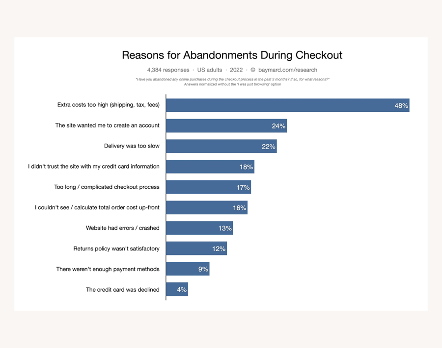 Wat weerhoudt mensen ervan om een checkout af te ronden, nadat ze de moeite hebben genomen om producten te selecteren en aan hun winkelmandje toe te voegen? Het Baymard Instituut, een UX research instelling, heeft daar het volgende diagram over samengesteld, met daarin de belangrijkste redenen: