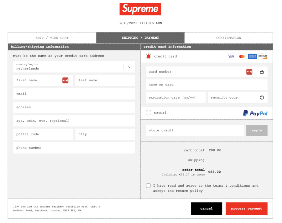 De compleet vernieuwde one-page checkout naar alle gebruikers, die tijdens de Winter 2023 Editions werd aangekondigd, is nu live. Het gaat de huidige, vertrouwde checkout vervangen, waar klanten door drie pagina's klikken om hun persoonlijke gegevens in te vullen, een verzendoptie te selecteren en hun bestelling af te rekenen. De nieuwe checkout heeft minder velden om in te vullen, en maar een pagina om te laden in plaats van verschillende. De checkout pagina gaat ook sneller laden - dat heeft trouwens te maken met Shopify’s recente uitbreiding van hun globale infrastructuur, ook aangekondigd in de Winter 2023 Editions.