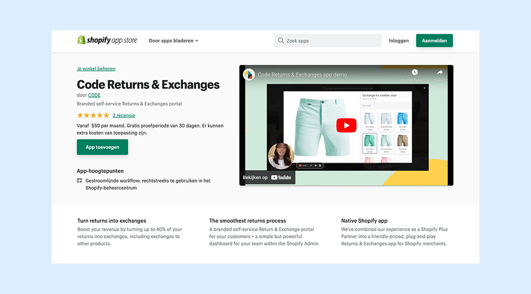 Een prettig retourproces is belangrijk voor een goede klantervaring, maar heb je er weleens over nagedacht wat een goed ruilproces met je omzet kan doen? Met Returner (made by Code) creëer je een branded self-service retourportaal waarin jouw klanten snel en soepel hun retour aanmaken, en worden gestimuleerd om te ruilen in plaats van te retourneren. Zo behoud je tot wel 40% van je omzet, en creëer je zelfs extra omzet via upselling (ruilen voor een duurder product).
