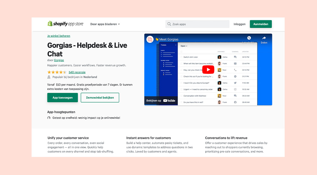 Gorgias is hands-down het beste helpdesk en live chat platform voor Shopify webshops. Waarom? De app organiseert alle inkomende customer support vragen uit kanalen zoals Instagram, Whatsapp, Facebook, e-mail, telefoon en live chat op één plek en voorziet jouw klantenservice team van complete order informatie en automatische antwoorden op veelgestelde vragen. Deze app heeft alles voor een supersnelle en efficiënte klantenservice: Gorgias bespaart je zeeën van tijd, verhoogt de aankoopfrequentie van jouw klanten, en zorgt voor maar liefst 20-30% conversie op support tickets.