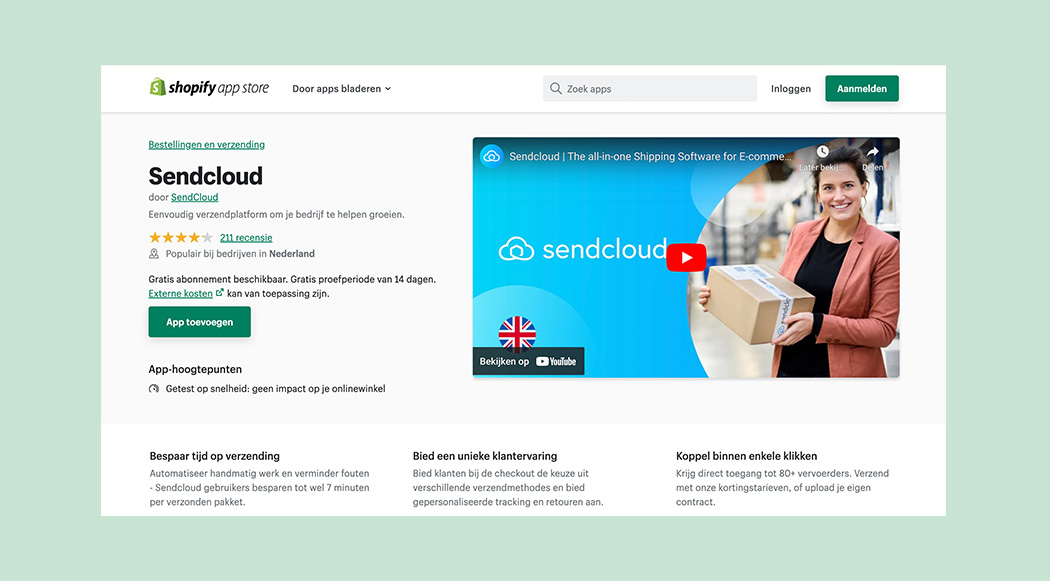 Sendcloud is een klassieker waar we bij Code al heel lang mee werken. Het is al jaren de go-to verzending app voor Europa en helpt je op bijzonder effectieve wijze om de verzending van jouw orders in te richten. Vooral als je meerdere stores hebt is Sendcloud nuttig, omdat je inzicht krijgt in welke logistieke opties de beste match zijn qua beschikbaarheid en prijs. Je kunt kiezen uit heel veel verzenddiensten en het hele proces automatiseren, van pakketlabels printen tot tracking emails naar klanten sturen... en nog veel meer.