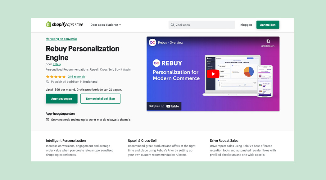 Personalisatie is een must voor e-commerce merken die een excellente klantervaring willen bieden. Rebuy Personalization Engine geeft je sales, AOV en retentie een flinke boost via upselling en cross-selling. Met behulp van AI zorgt de app ervoor dat relevante producten en aanbiedingen op het juiste moment en op de juiste plaats aan jouw klanten worden getoond: gerelateerde producten in de checkout, product upgrades op de productpagina, en nog veel meer. Deze app is binnen een paar minuten geïnstalleerd en zodra je je tags hebt ingericht ben je klaar om meer omzet te genereren. Meer dan 10.000 merken vertrouwen al op Rebuy.