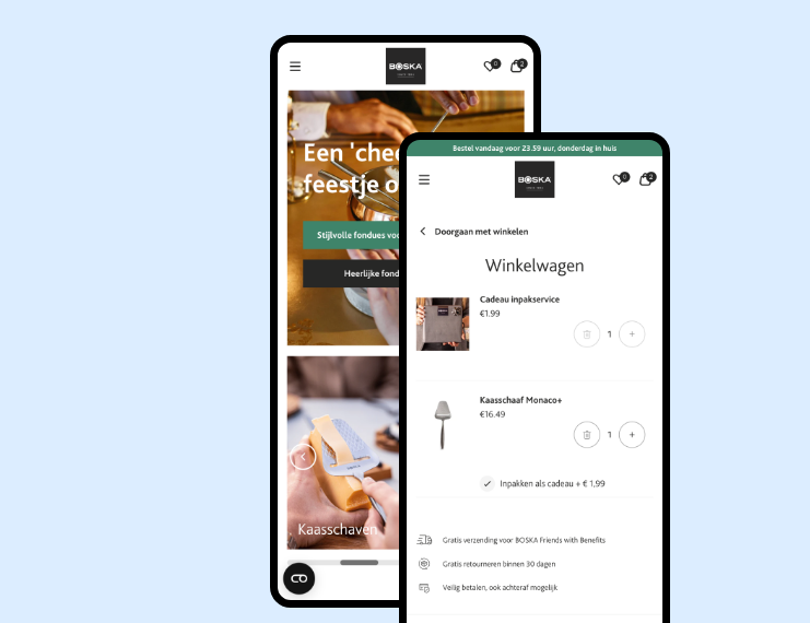 - Cart. De Shopify-cart is snel en overal toegankelijk. Wouter: "Het is edge-deployed, wat betekent dat het net zo snel zal zijn op een afgelegen Balinees strand als in het centrum van Amsterdam. Shopify's wereldwijde infrastructuur is onlangs aanzienlijk uitgebreid en kan nu zelfs de meest afgelegen plaatsen bedienen, zonder een slag over te slaan."