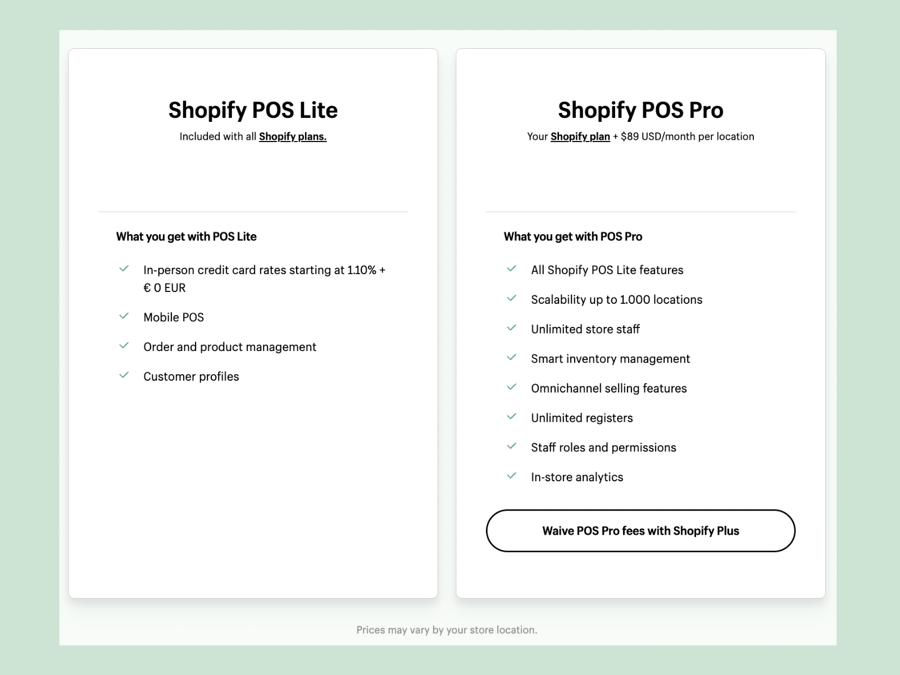 Shopify POS komt in twee smaken: Lite en Pro. POS Lite is gratis voor alle Shopify gebruikers en geeft je de basics voor verkopen op locatie. Het is geoptimaliseerd voor merchants die af en toe producten verkopen op markten, in pop-up stores en tijdens evenementen. Je kunt er nieuwe klanten mee registreren, bonnen versturen via email, retouren beheren, kortingen verrekenen en nuttige inzichten krijgen via gedetailleerde rapportages. Afhankelijk van je merk kan Shopify Lite tot 4 fysieke verkooppunten bedienen.