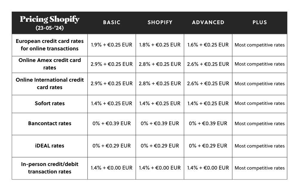Als je inderdaad Shopify Payments gebruikt, dan gelden de transactiekosten die hieronder weergegeven zijn: %20(1).png?width=1000&height=641&name=Pricing%20tabel%20(1000%20x%20800%20px)%20(1).png)