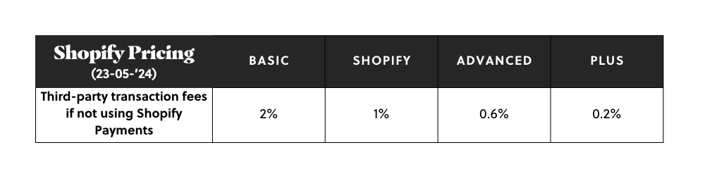 Als je dat doet, houd dan in gedachten dat Shopify haar gebruikers aanmoedigt om Shopify Payments, Shopify’s eigen PSP, te gebruiken in plaats van platforms als Mollie, Adyen en Pay.nl. Om die reden brengt Shopify third-party transactiekosten in rekening: een commissie op transacties die gedaan zijn via andere PSP’s dan Shopify Payments, voor security- en compliance kosten. De commissie is 0.20% (Shopify Plus) of 0.60% (Shopify Advanced) per transactie - bovenop de transactiekosten die in rekening gebracht worden door de externe payment provider.