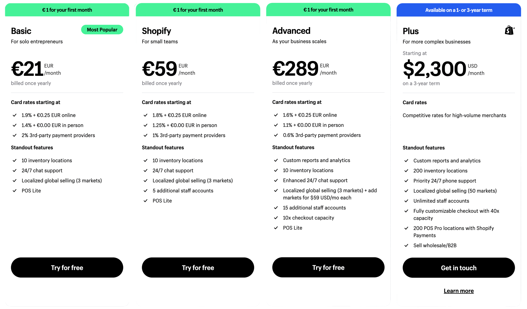 Zoals je ziet kost Shopify Plus in deze setup minder dan Shopify Advanced, terwijl het een enterprise-level variant van het platform biedt.
