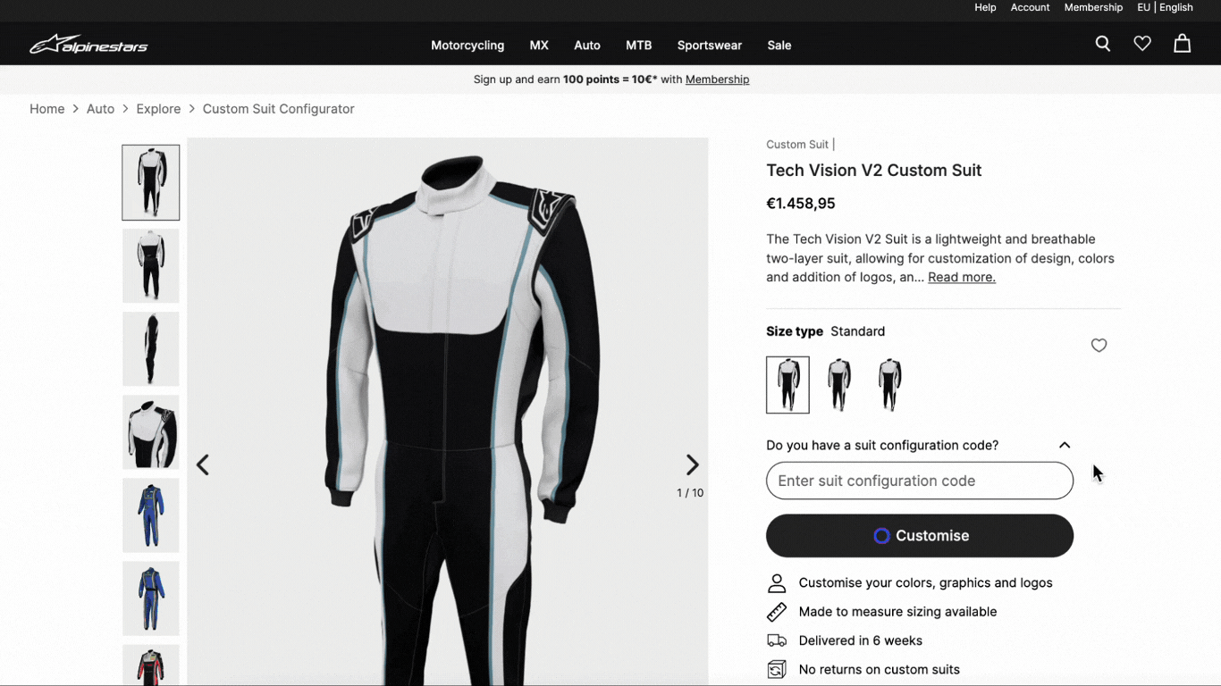 Alpinestars gebruikt Shopify Markets om de verschillende landen van Europa te bedienen. Lars Kristian: “Op die manier hoeven we niet alle stores te dupliceren, wat moeilijker te managen is. Met Markets kunnen we lokaliseren, terwijl het nog steeds mogelijk is om de site in een keer te updaten voor alle markten. Een nadeel van Markets is dat apps er niet altijd even goed mee geïntegreerd zijn. Yotpo loyalty punten toekennen in de UK is bijvoorbeeld een beetje vreemd: 1 punt is 1 euro waard, maar dat wordt in de UK 0,86 pond. Maar voor de overgrote meerderheid van de use cases werkt het prima.”